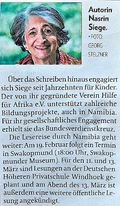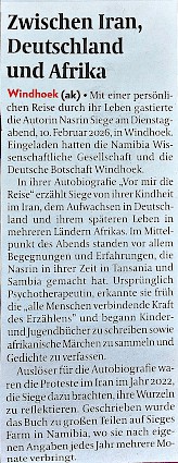 Am 10. 2. 2026 fand die erste Lesung statt und hier finden Sie einen sehr schönen Artikel dazu, erschienen am 11.2. 2026 in der "Allgemeinen Zeitung" von Namibia.