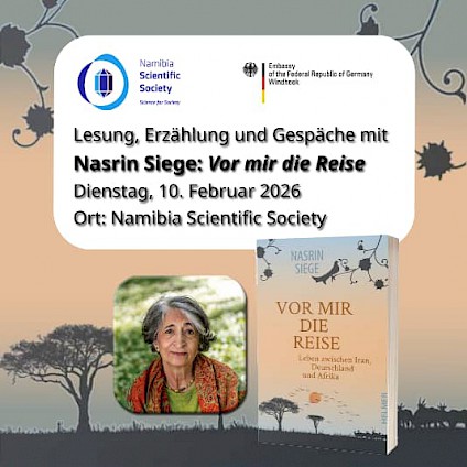"Die Namibia Scientific Society und die Deutsche Botschaft Windhoek laden zu einer Lesung mit Nasrin Siege ein.