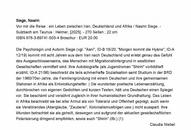 "Man kann nicht anders, als Nasrin Sieges ganzes Leben als eine „unendliche Reise“ zu bezeichnen, eine Reise zu anderen Menschen, anderen Völkern, einem anderen Kontinent." Schreibt Astrid van Nahl in ihrer wunderbaren Rezension im Onlinemagazin Alliteratus.