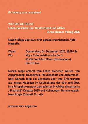 Am 4. Dezember 2025 habe ich meine Autobiografie "Vor mir die Reise" im Moya Café in Frankfurt Bockenheim vorgestellt.
